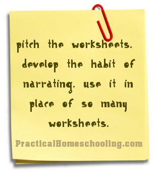 Pitch the worksheets. Develop the habit of narrating. Use it in place of so many worksheets.